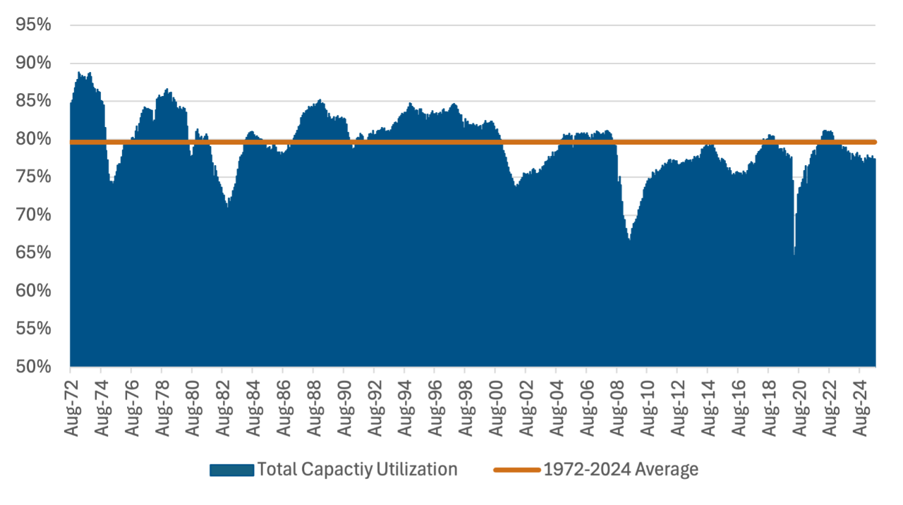 Across market groups, consumer durables gained 0.6%, mainly on automotive strength, and nondurables rose 0.3%. Business equipment slipped 0.1% due to weaker industrial machinery, despite gains in transit and IT equipment. Construction supplies advanced 0.6% but business supplies dropped 0.4%. Materials output edged up 0.1%. Within industries, durable goods rose 0.2%, supported by autos but offset by declines in fabricated metals and machinery. Nondurables climbed 0.3%, with textiles and petroleum leading the gains, while plastics and rubber declined. Mining capacity utilization increased to 90.6%, well above average, but utilities fell to 68.6%, significantly below historical norms.