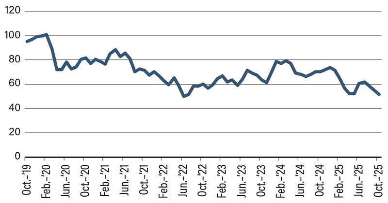 The S&P Global U.S. Composite Purchasing Managers’ Index rose to 54.8 in October from 53.9 in September, the highest since July and above the Q3 average, signaling continued expansion across manufacturing and services. Business activity increased for the 33rd consecutive month, supported by strong domestic demand. However, export orders declined further. Manufacturing firms scaled back input purchases as backlogs fell, resulting in a buildup of unsold inventories. Employment improved slightly but remained weak, especially in manufacturing, amid cautious business sentiment driven by policy uncertainty and tariff-related concerns. Lower interest rates provided some support to business confidence. While input costs continued to rise due to wage and tariff pressures, output prices increased at the slowest rate since April, suggesting easing inflationary momentum. Overall, the data point to steady but uneven growth, with ongoing cost challenges tempered by resilient demand and lower borrowing costs.