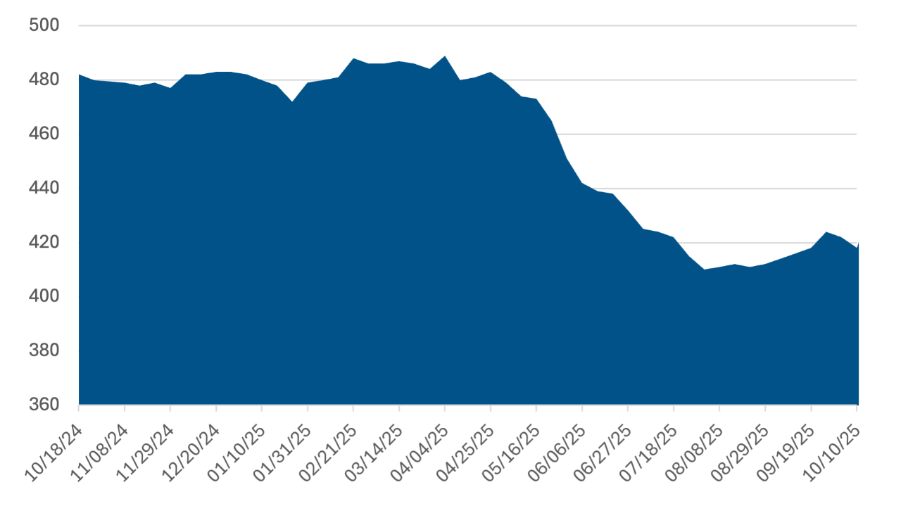 The Baker Hughes U.S. oil rig count slipped to 418 for the week ended October 10, a three-week low and slightly below expectations. At 418, activity sits roughly 16.3% below the longrun average of 499.5 and far below the October 2014 peak of 1,609. Rig count started falling in April and has settled at a lower level since August.