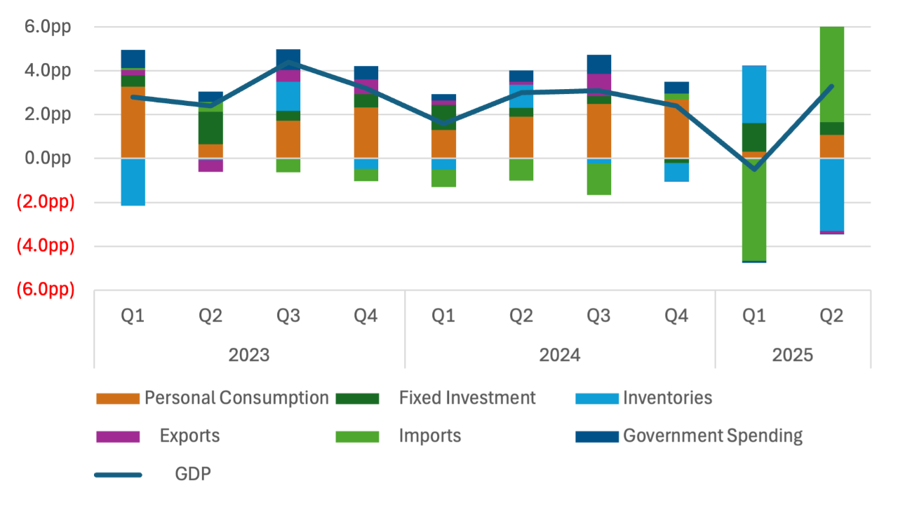 In the second quarter, the pattern reversed. Inventories dropped sharply, subtracting 3.29 points from GDP as the stockpile surge ended. Meanwhile, imports fell after tariffs were imposed, adding 5.09 points to growth. Overall, tariff-related business adjustments, rather than underlying demand, were the main drivers of volatility in the first half of 2025.