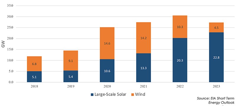 This has led to strong developer interest in solar, wind and battery storage projects, and the U.S. Energy Information Administration (EIA) expects additions to solar and battery capacity will account for more than half of all new electric sector capacity additions in 2022 and 2023.
