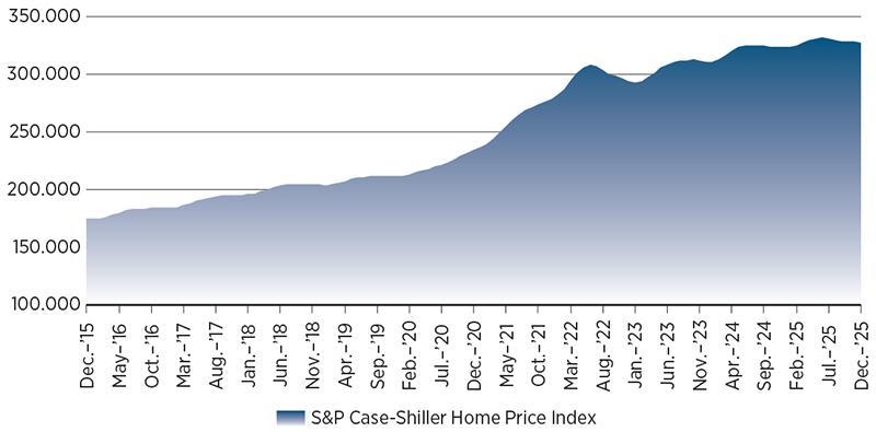 The S&P Cotality Case-Shiller Index showed U.S. home prices posted a 1.3% annual gain for December 2025, the weakest full-year growth since 2011 and well below the 10-year average of 5%–6%. Even excluding the pandemic surge, appreciation significantly underperformed historical norms. The 30-year mortgage rate ended 2025 at 6.2%, far above pre-2022 averages, constraining affordability and demand. Meanwhile, annual inflation of 2.7% exceeded home-price growth, a reversal from the prior decade when housing growth consistently outpaced inflation.