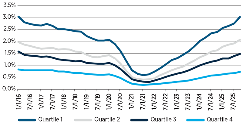 Notes: The chart plots new 90+ days delinquent mortgage balances by zip-income quartile. The lowest-income quartile is quartile 1; the highest-income quartile is quartile 4. Mortgage delinquency rates are at an annual rate, summing over the four quarters.