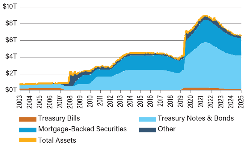 Since the Great Financial Crisis of 2008, the U.S. economy and financial markets have operated under an environment of extraordinarily accommodative monetary policy. Over time, the Fed’s balance sheet has become a central tool in sustaining that support. The Fed now uses its asset holdings to maintain a system of ample reserves—a framework in which banks hold more than enough liquidity to meet their needs without borrowing from one another, keeping short-term interest rates stable. Each time the Fed purchases securities, it credits banks’ reserve accounts, effectively creating new reserves.